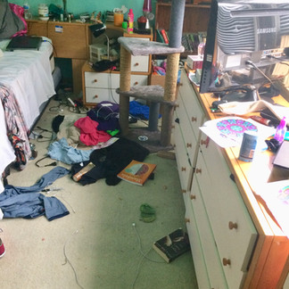 Because EVERY drawer was a junk drawer with no system, we had to wait till we went through the entire bedroom so I could see what actually would be left. Then after her trash duty was done- I would have her go through the piles to see if anything could go. After that, we started getting everything put away. If you see the wooden bookshelf area with the HUGE collection of hand sanitizer- that was completely done by her. She is the one living there and wanted to have it her way, which is okay if she will keep it neat.